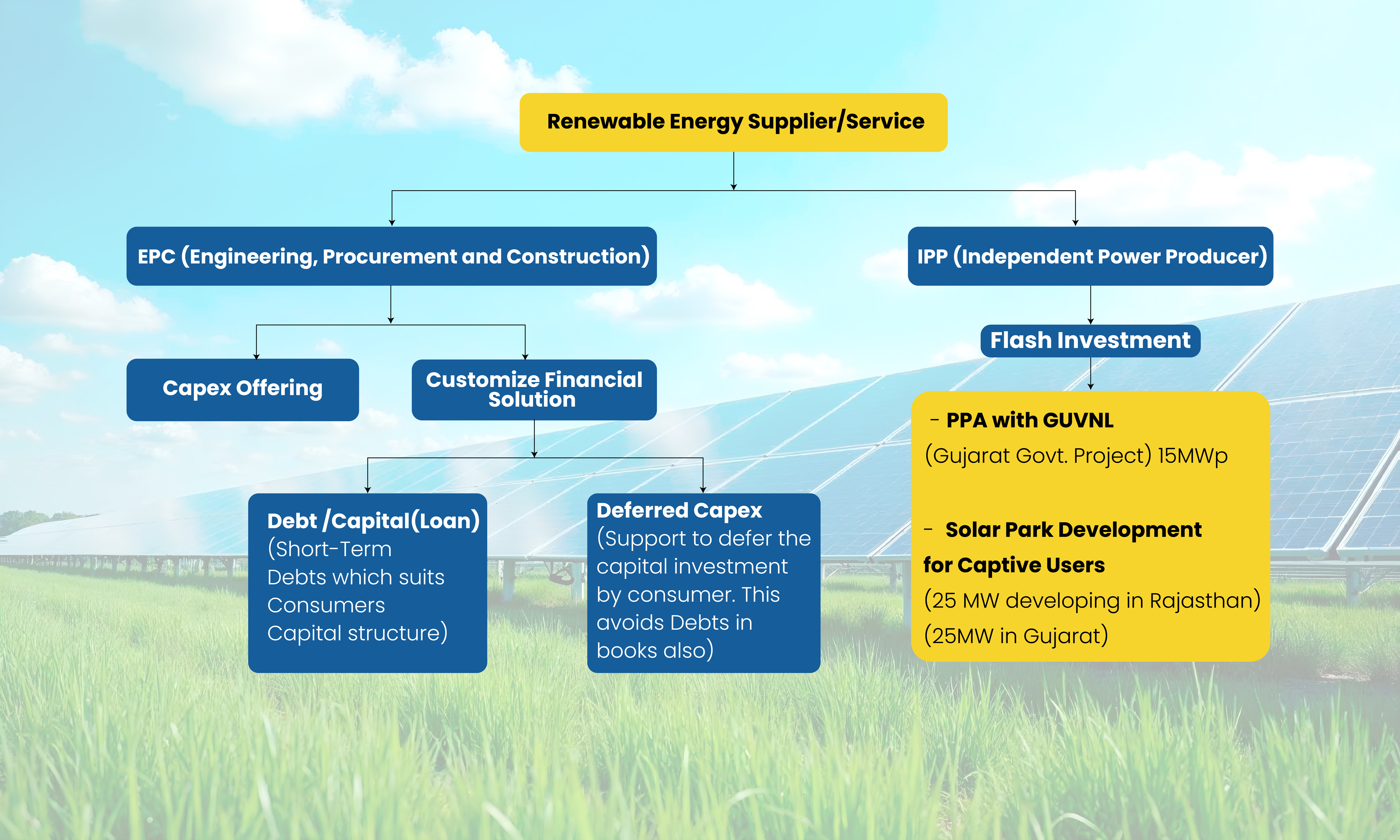Flash Green Energy Pvt. Ltd. is a dynamic renewable energy company offering comprehensive solutions across both EPC (Engineering, Procurement, and Construction) and IPP (Independent Power Producer). We specializes in delivering end-to-end solar power solutions for rooftop, ground-mounted, and industrial-scale projects, ensuring reliable, sustainable, and cost-effective energy generation.